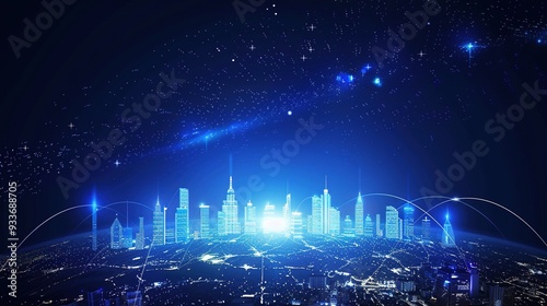 Stunning Blue Gradient Background with City Skyline on Earth’s Horizon, Night Sky, and Digital Technology Elements in High-Resolution Vector Illustration of Global Network and Urban Development