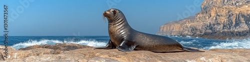Stunning California Sea Lion on Rocky Ocean Shore in Bright Sunlight, Captured with Waves and Scenic Cliff Background in Breathtaking Natural Marine Habitat