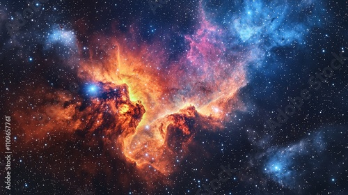 Stunning Celestial Nebula with Fiery Orange and Blue Colors Surrounded by Twinkling Stars in a Vast Cosmic Space Setting Captured in Stunning Detail