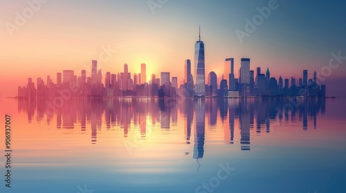 Stunning city skyline at sunrise, reflected perfectly in calm water, creating a beautiful and serene urban landscape scene.