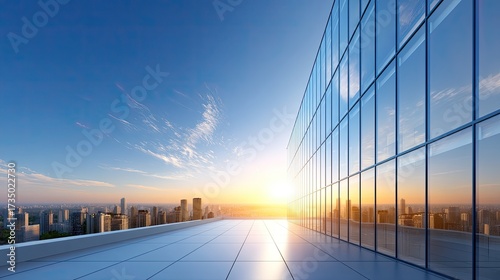 Stunning City Skyline at Sunset from Rooftop with Gleaming Glass Building and Vast Urban Landscape
