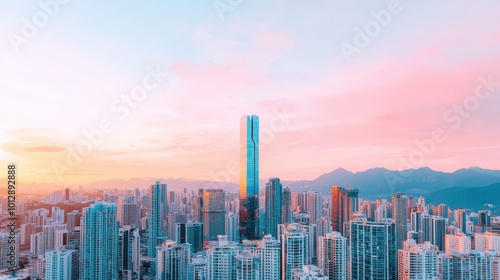 stunning cityscape at sunset, showcasing modern skyline with towering buildings and prominent skyscraper. vibrant colors of sky create serene atmosphere