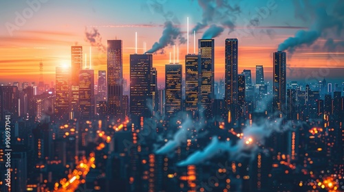Stunning cityscape at sunset with illuminated skyscrapers and haze. Capturing the vibrant essence of urban life and architectural marvels.