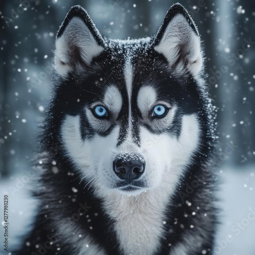 Stunning Close-Up of a Black and White Siberian Husky with Blue Eyes in Fresh Snow