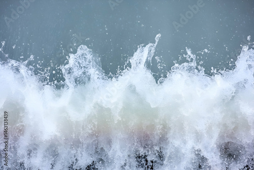 Stunning close-up of a wave crashing, showcasing dynamic water texture and splashing droplets. Perfect for designs needing an energetic, aquatic feel.