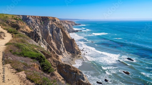 coastal, cliff, ocean, wave, beach, nature, landscape, scenic, seascape, coastline, horizon, blue, green, rock, sand, grass, tranquil, serene, beautiful, panoramic, travel, adventure, exploration, vista, shoreline, rugged, picturesque, idylli