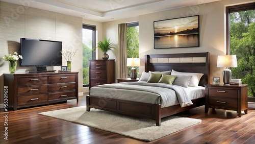 bedchamber, headboard, matching, dresser, large, screen, furniture, contemporary, decor, luxury, elegant, sophisticated, wooden, bed, room, suite, piece, finishing, accent, table, lamp, chest, storage, cabinet, drawer, placement, arrangement, layout