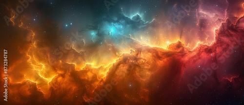 Stunning cosmic nebula with vibrant colors of orange, blue, and red, showcasing the breathtaking beauty of outer space and the universe.