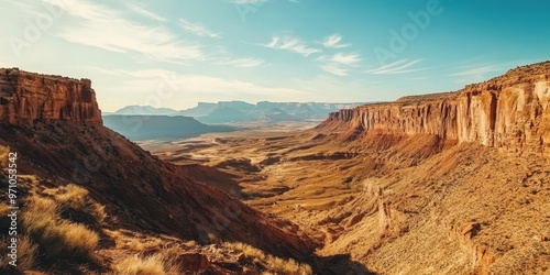 Stunning desert landscape with dramatic cliffs and vast valleys under a clear blue sky, perfect for nature and travel themes.
