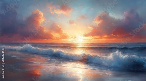 Stunning Digital Painting: Ocean Waves Crashing at Sunset. AI Generated