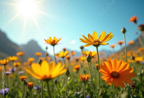 Stunning Display of Exotic Wildflower Bloom Overwhelming Lush Green Meadow Patch Under Bright Blue Sky