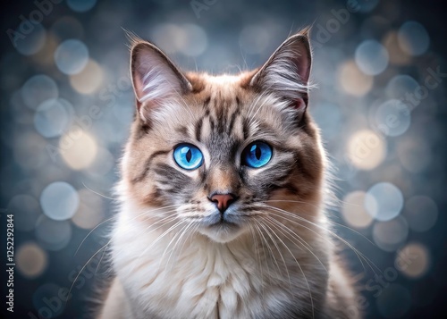 Stunning feline art: a blue-eyed cat's portrait, elegantly set against gray.