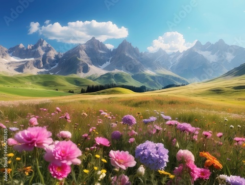 field, flower, mountain, nature, landscape, scenery, bloom, meadow, range, tranquil, serene, beauty, colourful, picturesque