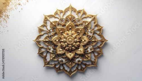 Stunning golden mandala design on a white background with intricate details and textures
