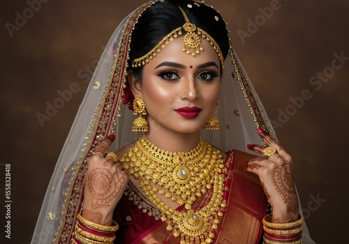 Stunning indian bride adorned with traditional gold jewelry and henna