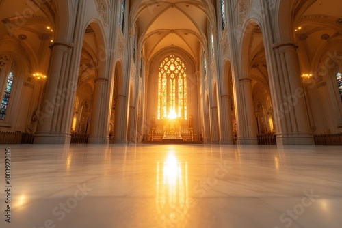 cathedral, interior, sunlight, stained-glass, architecture, religion, spiritual, light, column, floor, gothic, sacred, church, design, beauty, historic, elegance, serenity, atmosphere