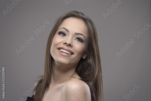 woman, beauty, face, portrait, looking up, satisfaction, happiness, imagination, thinking, positive, thought, carefree, youth, model, girl, skin, hair, fashion, female, healthy, care, make-up, perfection, womanly, feminine, smiling, toothy smile, white teeth, complexion, pretty, attractive, mixed race, latin, hispanic, caucasian, brunette, brown hair, copy space, grey background, pensive, beautiful, brown eyes, lip, expression, candid, idea, concept, studio, young, stunning