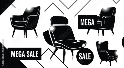 Stunning modern armchairs featured in dynamic mega sale promotions with bold typography professional illustration vector style artwork