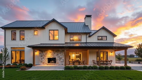Stunning Modern House with Inviting Porch, Cozy Fireplace, and Expansive Lawn Under a Beautiful Sunset Sky