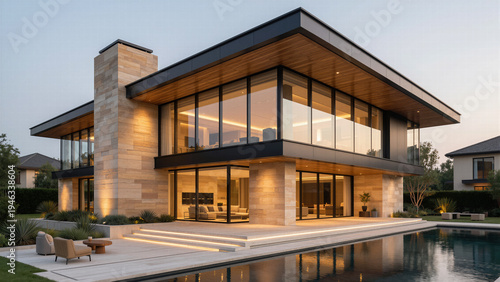 Stunning modern luxury house exterior design featuring a large swimming pool and expansive glass windows glowing warmly at twilight for real estate concepts.