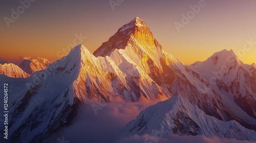 Stunning mountain peak bathed in golden light during sunset, surrounded by majestic snow-capped ranges and clouds for a breathtaking view of nature.
