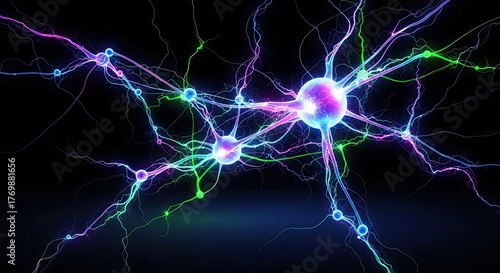 Stunning neuron connections glowing with vibrant colors, illustrating brain activity and neural networks for science, technology, and medical research concepts
