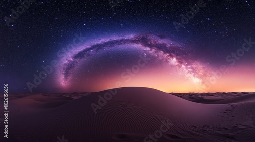 Stunning night sky over rolling sand dunes with the Milky Way arching gracefully above in vibrant colors and endless beauty.
