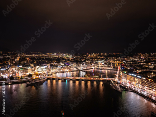 aerial, city, geneva, switzerland, city landscape, night, skyline, city lights, rhone, river, illuminated, building, bridge, urban, panorama, night photography, travel, tour tourism, destination, europa, swiss, city landscape, water reflection, night scene, scenic, beautiful, downtown, architecture, city view, european city, nightlight, aerial view, cinematic