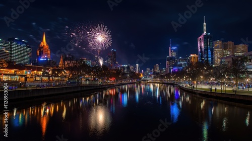 Stunning Nighttime Cityscape Skyline with Reflection and Fireworks Display Over the River