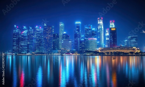 Stunning Nighttime Skyline of a Modern Cityscape with Bright Reflections in Water and Towering Skyscrapers Illuminated by Colorful Lights