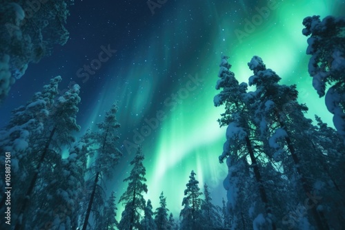 Stunning nighttime view of aurora borealis, with snow-covered trees in a forest under starry sky.