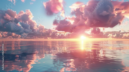 Stunning ocean view under sunset sky with pink clouds reflecting in water, creating picturesque scene. Nature's beauty amid climate change.