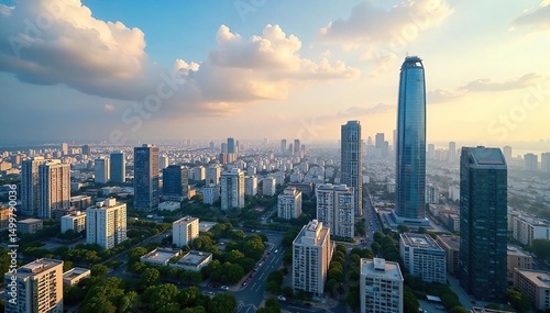 Stunning panoramic view of a modern city skyline dominated by towering office buildings, reflecting sunlight A vibrant display of architectural design and urban development , sun, steel