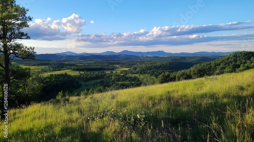 Stunning panoramic view of rolling hills and mountains under a cloudy blue sky at sunset : Generative AI