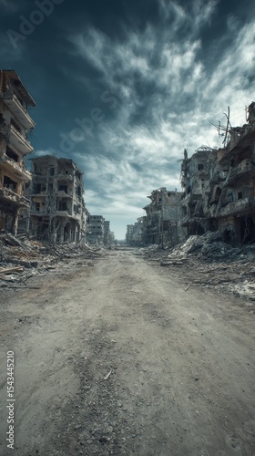 Stunning photo of empty street of burnt up city. Apocalyptic view of city downtown as disaster film poster concept. City destroyed by war.
