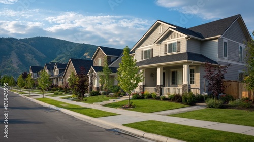 Stunning photo of row of beautiful houses in a suburban neighborhood with mountain view.