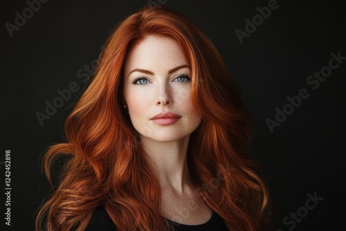 woman, portrait, redhead, hair, beauty, model, ginger, female, girl, face, eye, red, long, curly, wave, gorgeous, attractive, stunning, fashion, style, photo, photo, image, picture, studio, background, dark, black, elegant, glamour, classic, natural, freckle, lip, skin, expression, intense, serene, calm, confident, poise