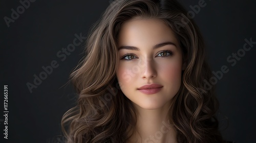 woman, portrait, beauty, model, hair, face, eye, make-up, fashion, girl, female, attractive, gorgeous, pretty, elegant, glamour, style, photo, image, picture, photo, studio, dark, background, brown, long, wave, curl, skin, lip, smile, expression, look, gaze, head shot, person, human, shoot, professional