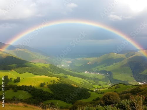 Stunning Rainbow Arching Over Green Rolling Hills and Valley Landscape Under Cloudy Sky.