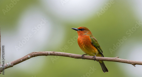 bird, wildlife, nature, animal, avian, feather, wing, perched, tree branch, tree, natural, wild, creature, fauna, small, vibrant, colourful, orange, green, brown, eye, beak, detail, close, profile, looking, side, solitary, serene, peaceful, calm, tranquil, beautiful, pretty, elegant, graceful, unique, exotic, tropical, forest, jungle, habitat, ecosystem, biodiversity, ornithology, conservation, research, study