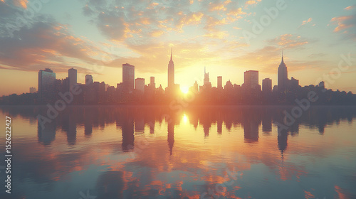 stunning skyline at sunset, reflecting on calm waters, creates serene atmosphere