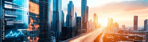 Stunning skyline view during sunset, showcasing modern buildings and vibrant city life. Perfect for urban and business themes.