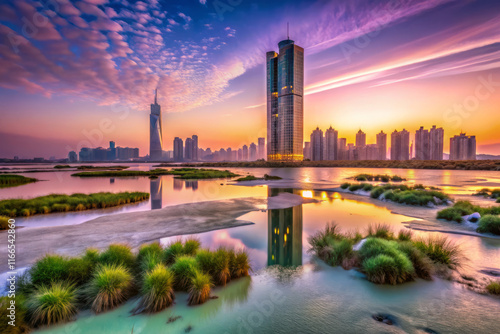 skyscraper, twilight, water, greenery, city landscape, sunset, skyline, modern, architecture, nature, urban, landscape, river, marsh, cloud, horizon, evening, tranquil, serene, vibrant, colourful, building, environment, wetland, grass, illumination, peaceful, scenic, panoramic