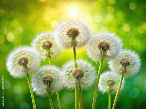 Stunning stock photo: white dandelions pop against a lush green background. Ideal for websites and print projects.