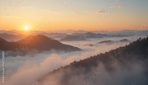 Stunning sunrise over foggy mountain range offering peaceful escape and sense of adventure