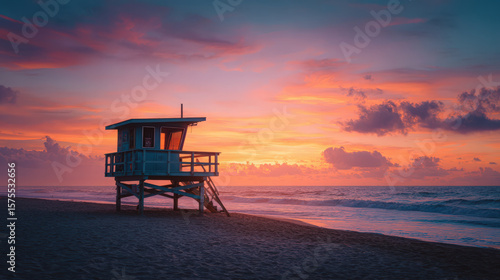 Stunning sunrise paints the sky over a beach with a lifeguard stand, perfect for a summer vacation.