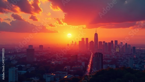 Stunning sunset hues paint a cityscape, illuminating buildings in warm golden light , glass, highrise