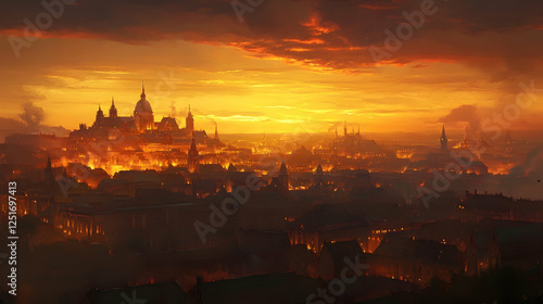 Stunning sunset over a city skyline, with golden hues casting a magical glow on the horizon