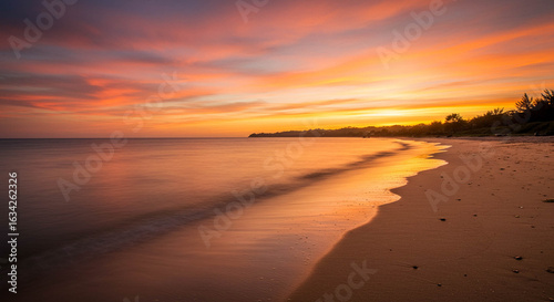 sunset, beach, ocean, sea, sky, cloud, orange, red, golden hour, dawn, dusk, landscape, nature, scenic, tranquil, peaceful, calm, horizon, water, sand, coastline, shore, wave, light, vibrant, colours, beauty, idylli, paradise, travel, vacation, summer, outdoors, natural, environment, serene, coastal, long exposure, smooth, dramatic, picturesque, warm, glow, sun, ray