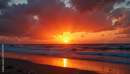 sunset, ocean, beach, sky, cloud, red, orange, vibrant, shoreline, calm, serene, nature, landscape, tranquil, golden hour, wave, peaceful, twilight, horizon, evening, seascape, scenic, beautiful, tropical, vacation, sunlight, sun, summer, travel, paradise, dusk, water, coastline, romantic, panoramic, dramatic, tour tourism, idylli, cloudscape, coastal, meditation, outdoors, natural beauty, sunrise, scenery, warm, evening light